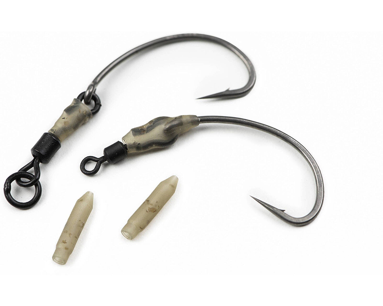 Fox Edges Ronnie Sleeves fixeren op een zeer gemakkelijke wijze de wartel aan het haakoog voor het maken van Ronnie/Spinner rigs. Ontworpen om over de haakpunt en haaksteel te schuiven en vervolgens over het oog en de Kwik Change Hook Swivel. Het geheel wordt dan stevig bij elkaar gehouden en gebruik van shrink tube is niet meer nodig. De getaperde punt verzekert een nette set-up. De sleeve kan zelfs opnieuw worden gebruikt voor het snel verwisselen van haak.